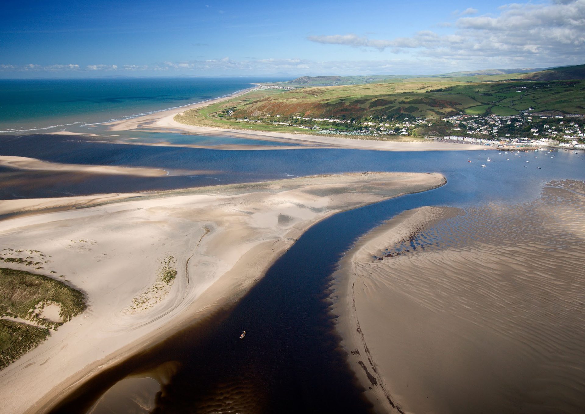 danfon mwy o waddodion o Afon Leri, bellach wedi’i dargyfeirio i aber afon Dyfi