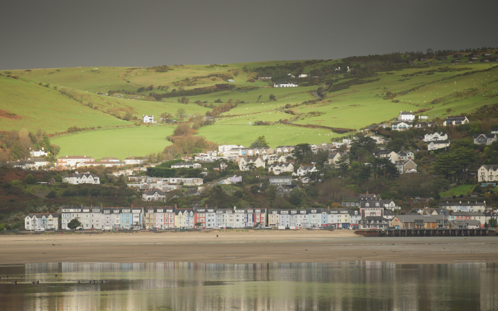 – wedi’i ddangos mewn gwyrdd golau ar hyd ymyl deheuol yr aber
